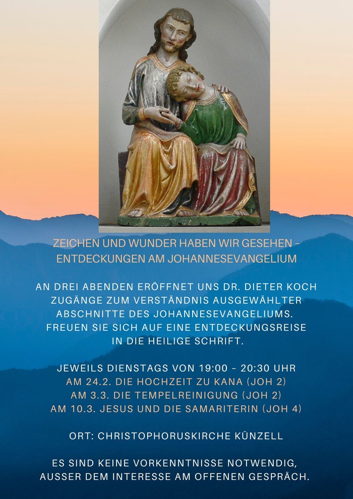 Unter dem Leitwort „Zeichen und Wunder haben wir gesehen“ lädt Pfarrer Dr. Dieter Koch zu einer spannenden Entdeckungsreise durch die Wundergeschichten des Johannes-Evangeliums ein. Zum Auftakt der Vortragsreihe stand das Weinwunder bei der Hochzeit zu Kana im Mittelpunkt. Zunächst erläuterte Koch die Arbeit mit biblische Texten und welche besonderen theologischen Akzente das Johannes-Evangelium setzt. Anschließend nahm er die Teilnehmenden mit in die Bildsprache der Erzählung hinein und erklärte anschaulich die Bedeutung ihrer Symbole. Besonders der Wein wurde dabei als Ausdruck von Freude und göttlichem Überfluss hervorgehoben. Die Reihe wird am 3. März und 10. März in der Christophoruskirche fortgesetzt. Alle Interessierten sind auch ohne Vorkenntnisse herzlich willkommen.
