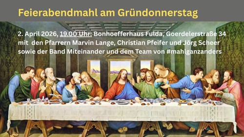 Wir feiern Abendmahl und essen gemeinsam. Oder wir essen gemeinsam und feiern gleichzeitig Abendmahl. Umrahmt von Lob- und Dankliedern vollziehen wir nach, wie Jesus mit seinen Jüngern beim letzten Abendmahl gefeiert hat. Dabei entsteht ein Bild, das starke Anklänge an Leonardo Da Vincis "Letztes Abendmahl" haben wird.